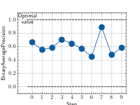 >>> # Example plotting multiple values >>> import torch >>> from torchmetrics.classification import BinaryAveragePrecision >>> metric = BinaryAveragePrecision() >>> values = [ ] >>> for _ in range(10): ... values.append(metric(torch.rand(20,), torch.randint(2, (20,)))) >>> fig_, ax_ = metric.plot(values)