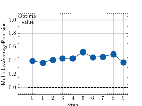 >>> # Example plotting multiple values >>> import torch >>> from torchmetrics.classification import MulticlassAveragePrecision >>> metric = MulticlassAveragePrecision(num_classes=3) >>> values = [ ] >>> for _ in range(10): ... values.append(metric(torch.randn(20, 3), torch.randint(3, (20,)))) >>> fig_, ax_ = metric.plot(values)