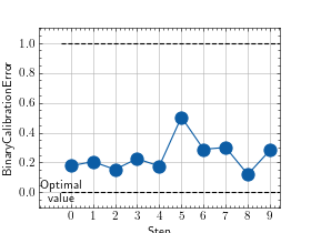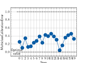 \[\text{ECE} = \sum_i^N b_i \|(p_i - c_i)\|, \text{L1 norm (Expected Calibration Error)}\]\[\text{MCE} = \max_{i} (p_i - c_i), \text{Infinity norm (Maximum Calibration Error)}\]\[\text{RMSCE} = \sqrt{\sum_i^N b_i(p_i - c_i)^2}, \text{L2 norm (Root Mean Square Calibration Error)}\]Where \(p_i\) is the top-1 prediction accuracy in bin \(i\), \(c_i\) is the average confidence of predictions in bin \(i\), and \(b_i\) is the fraction of data points in bin \(i\). Bins are constructed in an uniform way in the [0,1] range.