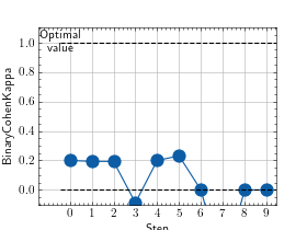 >>> from torch import rand, randint >>> # Example plotting multiple values >>> from torchmetrics.classification import BinaryCohenKappa >>> metric = BinaryCohenKappa() >>> values = [ ] >>> for _ in range(10): ... values.append(metric(rand(10), randint(2,(10,)))) >>> fig_, ax_ = metric.plot(values)