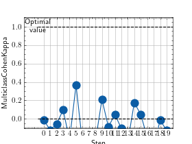 >>> from torch import randn, randint >>> # Example plotting a multiple values >>> from torchmetrics.classification import MulticlassCohenKappa >>> metric = MulticlassCohenKappa(num_classes=3) >>> values = [] >>> for _ in range(20): ... values.append(metric(randn(20,3).softmax(dim=-1), randint(3, (20,)))) >>> fig_, ax_ = metric.plot(values)