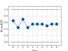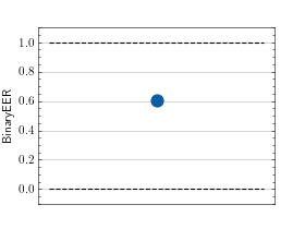 \[\text{EER} = \frac{\text{FAR} + (1 - \text{FRR})}{2}, \text{where} \min_t abs(FAR_t-FRR_t)\]The Equal Error Rate (EER) is the point where the False Positive Rate (FPR) and True Positive Rate (TPR) are equal, or in practise minimized. A lower EER value signifies higher system accuracy.