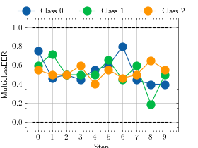 >>> # Example plotting multiple values >>> import torch >>> from torchmetrics.classification import MulticlassEER >>> metric = MulticlassEER(num_classes=3) >>> values = [ ] >>> for _ in range(10): ... values.append(metric(torch.randn(20, 3), torch.randint(3, (20,)))) >>> fig_, ax_ = metric.plot(values)