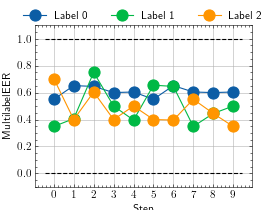 >>> # Example plotting multiple values >>> import torch >>> from torchmetrics.classification import MultilabelEER >>> metric = MultilabelEER(num_labels=3) >>> values = [ ] >>> for _ in range(10): ... values.append(metric(torch.rand(20,3), torch.randint(2, (20,3)))) >>> fig_, ax_ = metric.plot(values)