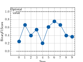>>> from torch import rand, randint >>> # Example plotting multiple values >>> from torchmetrics.classification import BinaryF1Score >>> metric = BinaryF1Score() >>> values = [ ] >>> for _ in range(10): ... values.append(metric(rand(10), randint(2,(10,)))) >>> fig_, ax_ = metric.plot(values)