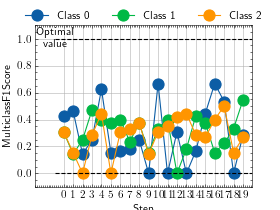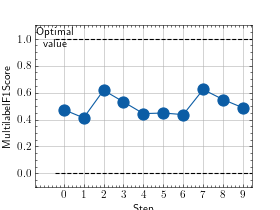 >>> from torch import rand, randint >>> # Example plotting multiple values >>> from torchmetrics.classification import MultilabelF1Score >>> metric = MultilabelF1Score(num_labels=3) >>> values = [ ] >>> for _ in range(10): ... values.append(metric(randint(2, (20, 3)), randint(2, (20, 3)))) >>> fig_, ax_ = metric.plot(values)