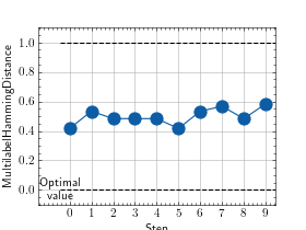 \[\text{Hamming distance} = \frac{1}{N \cdot L} \sum_i^N \sum_l^L 1(y_{il} \neq \hat{y}_{il})\]Where \(y\) is a tensor of target values, \(\hat{y}\) is a tensor of predictions, and \(\bullet_{il}\) refers to the \(l\)-th label of the \(i\)-th sample of that tensor.