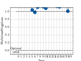 >>> # Example plotting a multiple values per class >>> from torch import randint, randn >>> from torchmetrics.classification import MulticlassHingeLoss >>> metric = MulticlassHingeLoss(num_classes=3) >>> values = [] >>> for _ in range(20): ... values.append(metric(randn(20, 3), randint(3, (20,)))) >>> fig_, ax_ = metric.plot(values)