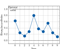 >>> # Example plotting multiple values >>> from torch import rand, randint >>> from torchmetrics.classification import BinaryJaccardIndex >>> metric = BinaryJaccardIndex() >>> values = [ ] >>> for _ in range(10): ... values.append(metric(rand(10), randint(2,(10,)))) >>> fig_, ax_ = metric.plot(values)