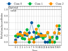 >>> # Example plotting a multiple values per class >>> from torch import randint >>> from torchmetrics.classification import MulticlassJaccardIndex >>> metric = MulticlassJaccardIndex(num_classes=3, average=None) >>> values = [] >>> for _ in range(20): ... values.append(metric(randint(3, (20,)), randint(3, (20,)))) >>> fig_, ax_ = metric.plot(values)