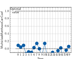 >>> from torch import rand, randint >>> # Example plotting multiple values >>> from torchmetrics.classification import BinaryMatthewsCorrCoef >>> metric = BinaryMatthewsCorrCoef() >>> values = [ ] >>> for _ in range(10): ... values.append(metric(rand(10), randint(2,(10,)))) >>> fig_, ax_ = metric.plot(values)