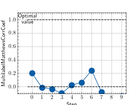 >>> from torch import rand, randint >>> # Example plotting multiple values >>> from torchmetrics.classification import MultilabelMatthewsCorrCoef >>> metric = MultilabelMatthewsCorrCoef(num_labels=3) >>> values = [ ] >>> for _ in range(10): ... values.append(metric(randint(2, (20, 3)), randint(2, (20, 3)))) >>> fig_, ax_ = metric.plot(values)