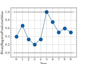 >>> from torch import rand, randint >>> # Example plotting multiple values >>> from torchmetrics.classification import BinaryNegativePredictiveValue >>> metric = BinaryNegativePredictiveValue() >>> values = [ ] >>> for _ in range(10): ... values.append(metric(rand(10), randint(2,(10,)))) >>> fig_, ax_ = metric.plot(values)