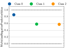 \[\text{Negative Predictive Value} = \frac{\text{TN}}{\text{TN} + \text{FN}}\]Where \(\text{TN}\) and \(\text{FN}\) represent the number of true negatives and false negatives respectively. The metric is only proper defined when \(\text{TN} + \text{FN} \neq 0\). If this case is encountered for any class, the metric for that class will be set to 0 and the overall metric may therefore be affected in turn.