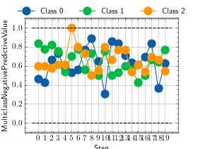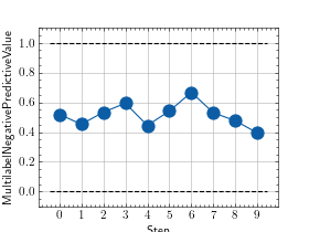 >>> from torch import rand, randint >>> # Example plotting multiple values >>> from torchmetrics.classification import MultilabelNegativePredictiveValue >>> metric = MultilabelNegativePredictiveValue(num_labels=3) >>> values = [ ] >>> for _ in range(10): ... values.append(metric(randint(2, (20, 3)), randint(2, (20, 3)))) >>> fig_, ax_ = metric.plot(values)