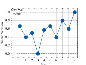 >>> from torch import rand, randint >>> # Example plotting multiple values >>> from torchmetrics.classification import BinaryPrecision >>> metric = BinaryPrecision() >>> values = [ ] >>> for _ in range(10): ... values.append(metric(rand(10), randint(2,(10,)))) >>> fig_, ax_ = metric.plot(values)