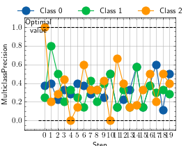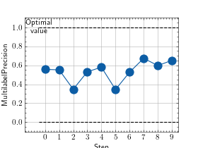 >>> from torch import rand, randint >>> # Example plotting multiple values >>> from torchmetrics.classification import MultilabelPrecision >>> metric = MultilabelPrecision(num_labels=3) >>> values = [ ] >>> for _ in range(10): ... values.append(metric(randint(2, (20, 3)), randint(2, (20, 3)))) >>> fig_, ax_ = metric.plot(values)