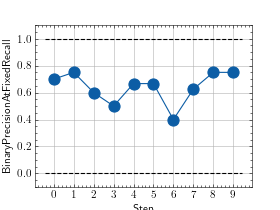 >>> from torch import rand, randint >>> # Example plotting multiple values >>> from torchmetrics.classification import BinaryPrecisionAtFixedRecall >>> metric = BinaryPrecisionAtFixedRecall(min_recall=0.5) >>> values = [ ] >>> for _ in range(10): ... # we index by 0 such that only the maximum recall value is plotted ... values.append(metric(rand(10), randint(2,(10,)))[0]) >>> fig_, ax_ = metric.plot(values)
