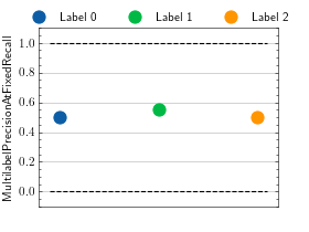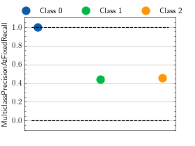 >>> from torch import rand, randint >>> # Example plotting a single value per class >>> from torchmetrics.classification import MulticlassPrecisionAtFixedRecall >>> metric = MulticlassPrecisionAtFixedRecall(num_classes=3, min_recall=0.5) >>> metric.update(rand(20, 3).softmax(dim=-1), randint(3, (20,))) >>> fig_, ax_ = metric.plot() # the returned plot only shows the maximum recall value by default