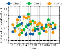 >>> from torch import rand, randint >>> # Example plotting a multiple values per class >>> from torchmetrics.classification import MulticlassPrecisionAtFixedRecall >>> metric = MulticlassPrecisionAtFixedRecall(num_classes=3, min_recall=0.5) >>> values = [] >>> for _ in range(20): ... # we index by 0 such that only the maximum recall value is plotted ... values.append(metric(rand(20, 3).softmax(dim=-1), randint(3, (20,)))[0]) >>> fig_, ax_ = metric.plot(values)