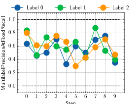 >>> from torch import rand, randint >>> # Example plotting multiple values >>> from torchmetrics.classification import MultilabelPrecisionAtFixedRecall >>> metric = MultilabelPrecisionAtFixedRecall(num_labels=3, min_recall=0.5) >>> values = [ ] >>> for _ in range(10): ... # we index by 0 such that only the maximum recall value is plotted ... values.append(metric(rand(20, 3), randint(2, (20, 3)))[0]) >>> fig_, ax_ = metric.plot(values)