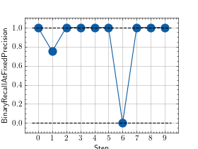 >>> from torch import rand, randint >>> # Example plotting multiple values >>> from torchmetrics.classification import BinaryRecallAtFixedPrecision >>> metric = BinaryRecallAtFixedPrecision(min_precision=0.5) >>> values = [ ] >>> for _ in range(10): ... # we index by 0 such that only the maximum recall value is plotted ... values.append(metric(rand(10), randint(2,(10,)))[0]) >>> fig_, ax_ = metric.plot(values)