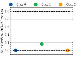>>> from torch import rand, randint >>> # Example plotting a single value per class >>> from torchmetrics.classification import MulticlassRecallAtFixedPrecision >>> metric = MulticlassRecallAtFixedPrecision(num_classes=3, min_precision=0.5) >>> metric.update(rand(20, 3).softmax(dim=-1), randint(3, (20,))) >>> fig_, ax_ = metric.plot() # the returned plot only shows the maximum recall value by default