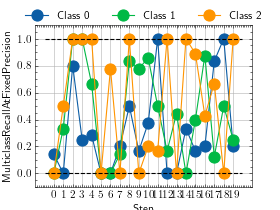>>> from torch import rand, randint >>> # Example plotting a multiple values per class >>> from torchmetrics.classification import MulticlassRecallAtFixedPrecision >>> metric = MulticlassRecallAtFixedPrecision(num_classes=3, min_precision=0.5) >>> values = [] >>> for _ in range(20): ... # we index by 0 such that only the maximum recall value is plotted ... values.append(metric(rand(20, 3).softmax(dim=-1), randint(3, (20,)))[0]) >>> fig_, ax_ = metric.plot(values)