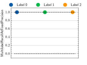 >>> from torch import rand, randint >>> # Example plotting a single value >>> from torchmetrics.classification import MultilabelRecallAtFixedPrecision >>> metric = MultilabelRecallAtFixedPrecision(num_labels=3, min_precision=0.5) >>> metric.update(rand(20, 3), randint(2, (20, 3))) >>> fig_, ax_ = metric.plot() # the returned plot only shows the maximum recall value by default
