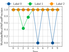 >>> from torch import rand, randint >>> # Example plotting multiple values >>> from torchmetrics.classification import MultilabelRecallAtFixedPrecision >>> metric = MultilabelRecallAtFixedPrecision(num_labels=3, min_precision=0.5) >>> values = [ ] >>> for _ in range(10): ... # we index by 0 such that only the maximum recall value is plotted ... values.append(metric(rand(20, 3), randint(2, (20, 3)))[0]) >>> fig_, ax_ = metric.plot(values)