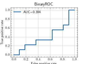 >>> from torch import rand, randint >>> from torchmetrics.classification import BinaryROC >>> preds = rand(20) >>> target = randint(2, (20,)) >>> metric = BinaryROC() >>> metric.update(preds, target) >>> fig_, ax_ = metric.plot(score=True)