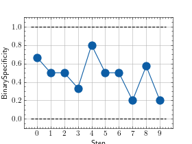 >>> from torch import rand, randint >>> # Example plotting multiple values >>> from torchmetrics.classification import BinarySpecificity >>> metric = BinarySpecificity() >>> values = [ ] >>> for _ in range(10): ... values.append(metric(rand(10), randint(2,(10,)))) >>> fig_, ax_ = metric.plot(values)