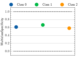 \[\text{Specificity} = \frac{\text{TN}}{\text{TN} + \text{FP}}\]Where \(\text{TN}\) and \(\text{FP}\) represent the number of true negatives and false positives respectively. The metric is only proper defined when \(\text{TN} + \text{FP} \neq 0\). If this case is encountered for any class, the metric for that class will be set to 0 and the overall metric may therefore be affected in turn.