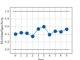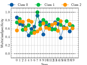 >>> from torch import rand, randint >>> # Example plotting multiple values >>> from torchmetrics.classification import MultilabelSpecificity >>> metric = MultilabelSpecificity(num_labels=3) >>> values = [ ] >>> for _ in range(10): ... values.append(metric(randint(2, (20, 3)), randint(2, (20, 3)))) >>> fig_, ax_ = metric.plot(values)