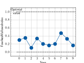 >>> # Example plotting multiple values >>> import torch >>> from torchmetrics.clustering import FowlkesMallowsIndex >>> metric = FowlkesMallowsIndex() >>> values = [ ] >>> for _ in range(10): ... values.append(metric(torch.randint(0, 4, (10,)), torch.randint(0, 4, (10,)))) >>> fig_, ax_ = metric.plot(values)