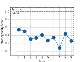 >>> # Example plotting multiple values >>> import torch >>> from torchmetrics.clustering import HomogeneityScore >>> metric = HomogeneityScore() >>> values = [ ] >>> for _ in range(10): ... values.append(metric(torch.randint(0, 4, (10,)), torch.randint(0, 4, (10,)))) >>> fig_, ax_ = metric.plot(values)