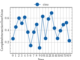 >>> # Example plotting multiple values >>> import torch >>> from torchmetrics.detection import CompleteIntersectionOverUnion >>> preds = [ ... { ... "boxes": torch.tensor([[296.55, 93.96, 314.97, 152.79], [298.55, 98.96, 314.97, 151.79]]), ... "scores": torch.tensor([0.236, 0.56]), ... "labels": torch.tensor([4, 5]), ... } ... ] >>> target = lambda : [ ... { ... "boxes": torch.tensor([[300.00, 100.00, 315.00, 150.00]]) + torch.randint(-10, 10, (1, 4)), ... "labels": torch.tensor([5]), ... } ... ] >>> metric = CompleteIntersectionOverUnion() >>> vals = [] >>> for _ in range(20): ... vals.append(metric(preds, target())) >>> fig_, ax_ = metric.plot(vals)