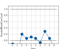 >>> from torch import randn >>> # Example plotting multiple values >>> from torchmetrics.regression import KendallRankCorrCoef >>> metric = KendallRankCorrCoef() >>> values = [] >>> for _ in range(10): ... values.append(metric(randn(10,), randn(10,))) >>> fig, ax = metric.plot(values)