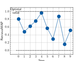 >>> import torch >>> from torchmetrics.retrieval import RetrievalMAP >>> # Example plotting multiple values >>> metric = RetrievalMAP() >>> values = [] >>> for _ in range(10): ... values.append(metric(torch.rand(10,), torch.randint(2, (10,)), indexes=torch.randint(2,(10,)))) >>> fig, ax = metric.plot(values)