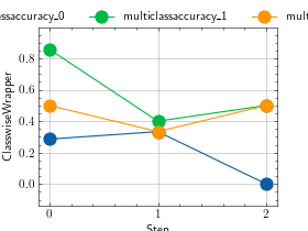 >>> # Example plotting multiple values >>> import torch >>> from torchmetrics.wrappers import ClasswiseWrapper >>> from torchmetrics.classification import MulticlassAccuracy >>> metric = ClasswiseWrapper(MulticlassAccuracy(num_classes=3, average=None)) >>> values = [ ] >>> for _ in range(3): ... values.append(metric(torch.randint(3, (20,)), torch.randint(3, (20,)))) >>> fig_, ax_ = metric.plot(values)